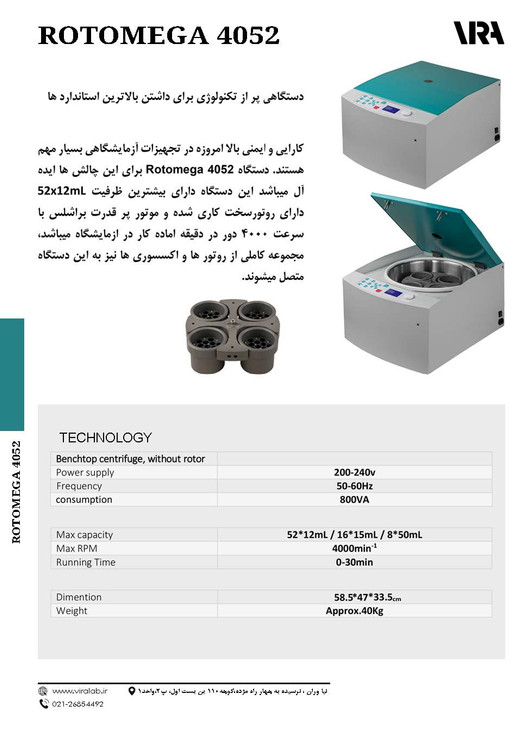 کارایی و ایمنی بالا امروزه در تجهیزات آزمایشگاهی بسیار مهم هستند. دستگاه Rotomega 4052 برای این چالش ها ایده آل میباشد این دستگاه دارای بیشترین ظرفیت 52x12mL دارای روتورسخت کاری شده و موتور پر قدرت براشلس با سرعت 4000 دور در دقیقه اماده کار در ازمایشگاه میباشد، مجموعه کاملی از روتور ها و اکسسوری ها نیز به این دستگاه متصل میشوند.